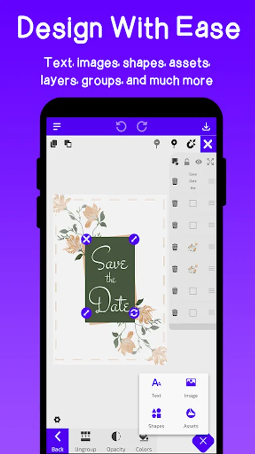--> Two types of assets: Images with you can edit by cropping or adding a filter to, And shapes which you can modify and color.