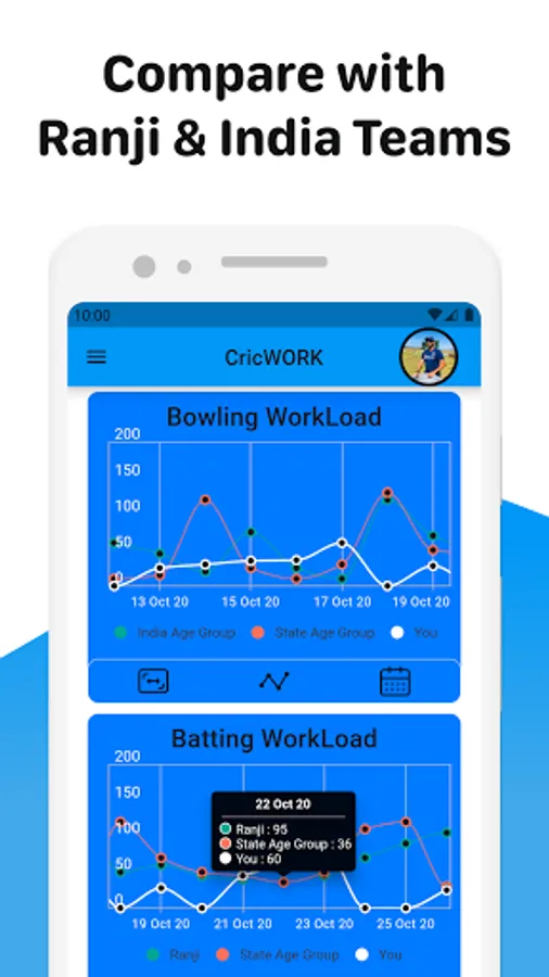 You can see the Graphs of all your Workload types, to Compare with Top Professional Players. For Eg. Know the Average Batting Workload of your State Association Players and compare if you Bat for more number of Balls or less through the weeks and months. Know how many balls do the top Bowlers bowl in a month to maintain the level of Professionalism required.