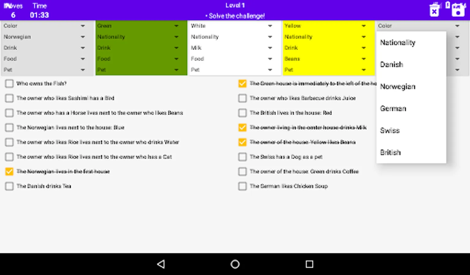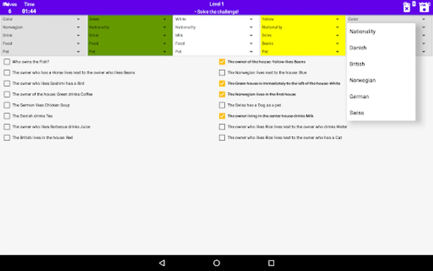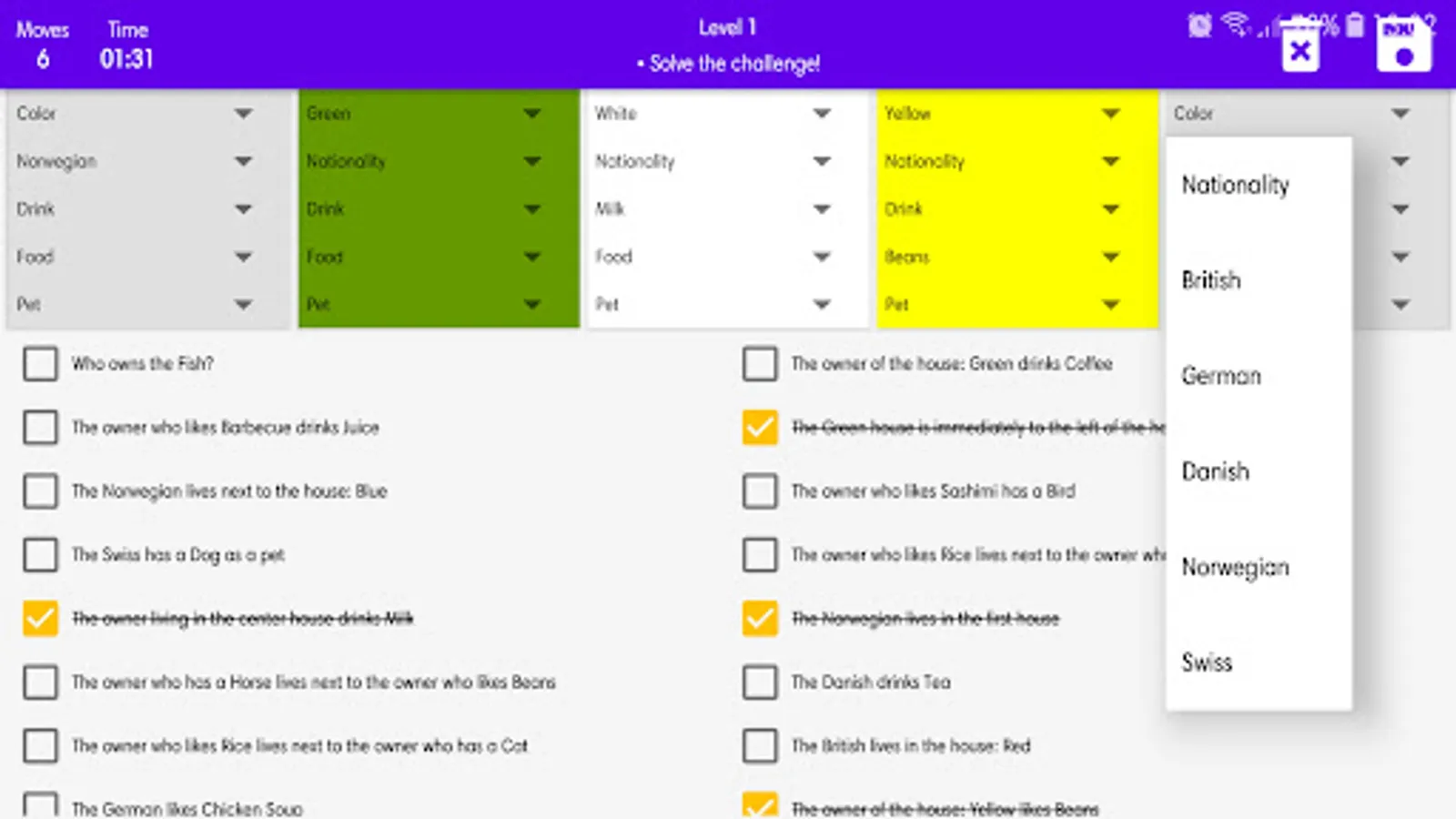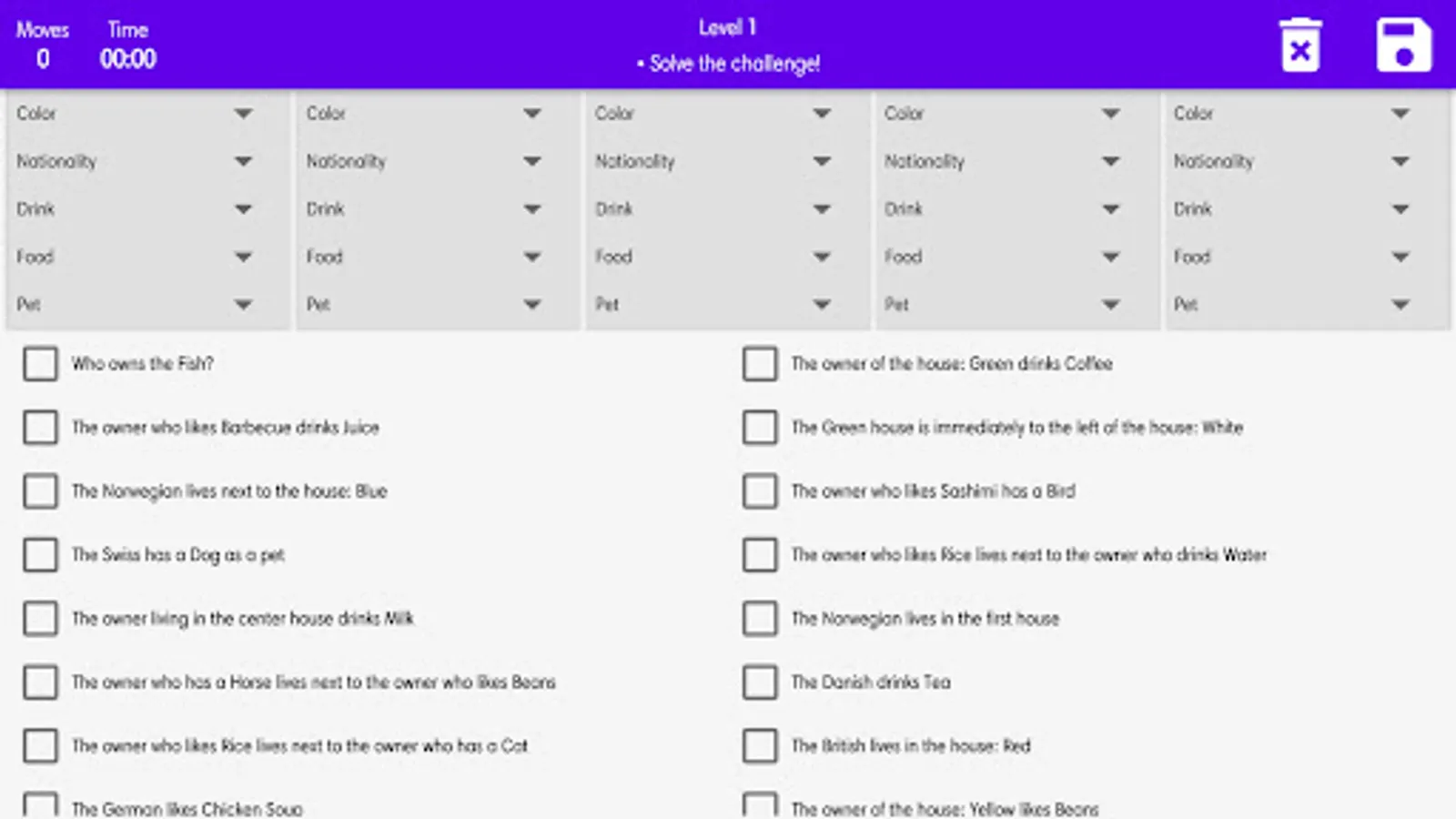 Have you ever heard about the Einstein's riddle? Enjoy one of the simplest and most challenging thinking games around! This little logic game will require a little more than logical thinking and patience to complete it.