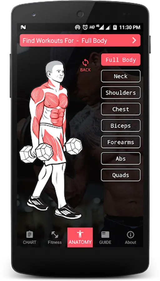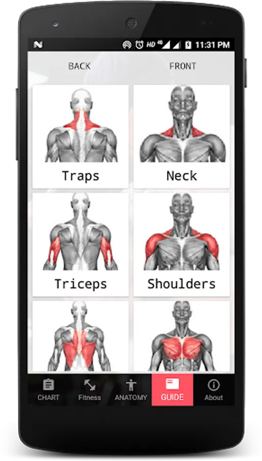 - Guidance for major muscles group like neck, shoulders, chest, biceps, forearms, abs and may others.