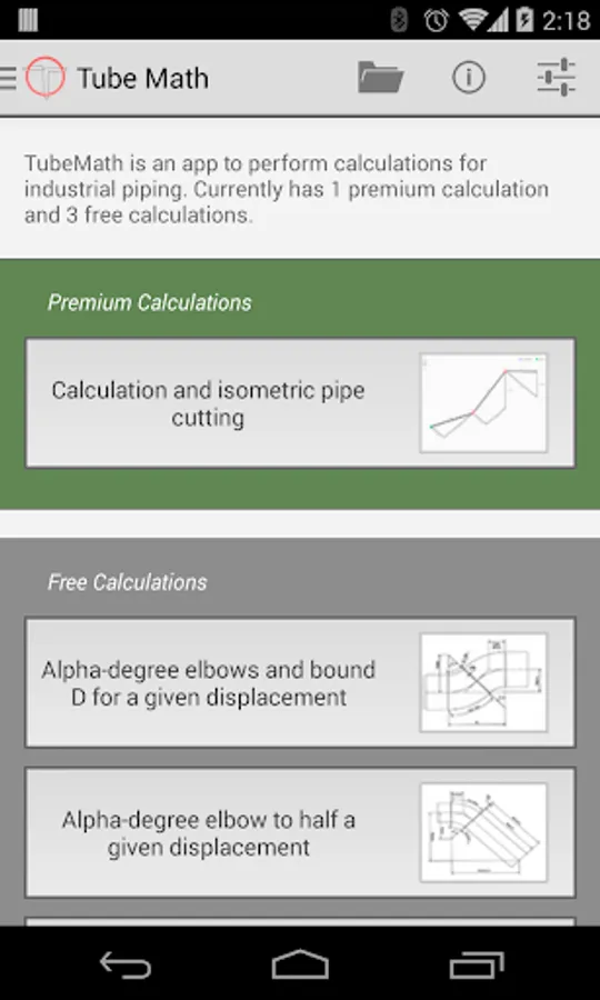 Calculator to solve problems that typically arise in pipe fitting. It works the same way as a spreadsheet, entering data to generate result instantly. Tube Math is destined to professional pipefitter or jobs related to pipe fitting industry.