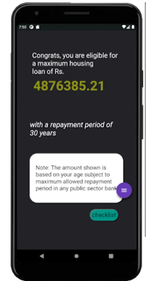 This app is designed as per loan guidelines of major public sector banks. This app will help you to know the exact quantum of loan amount as per the details of income you enter. Also a checklist was added in the last screen to know mandatory documents needed for housing loan.