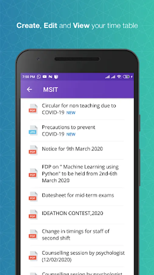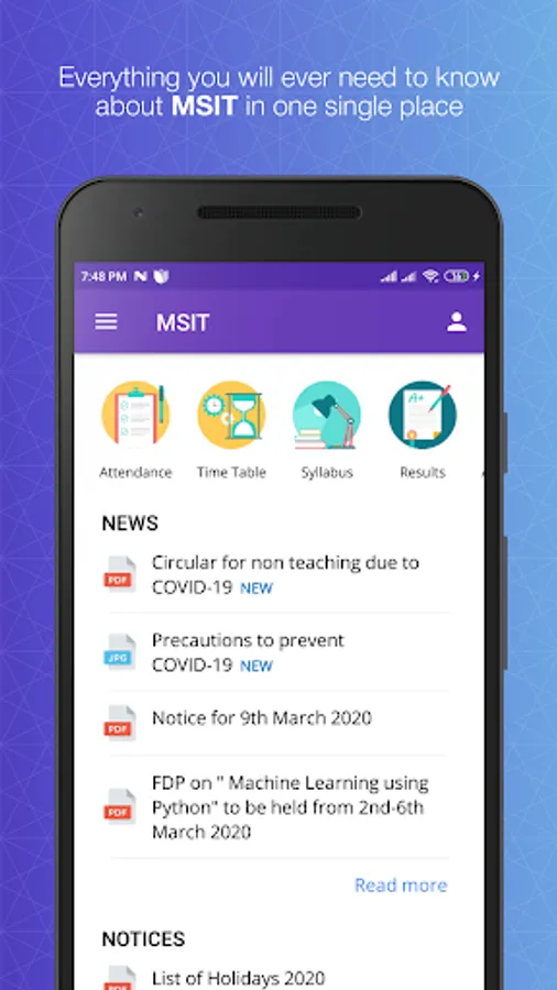 MSIT is an app that binds together all the things be it notices, results, attendance, time table, syllabus, notes etc. all at one place and makes your college life a lot easier.