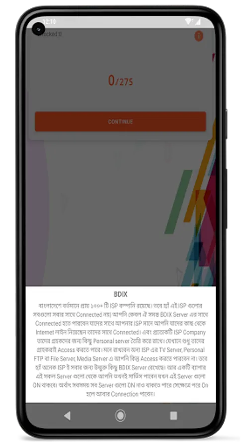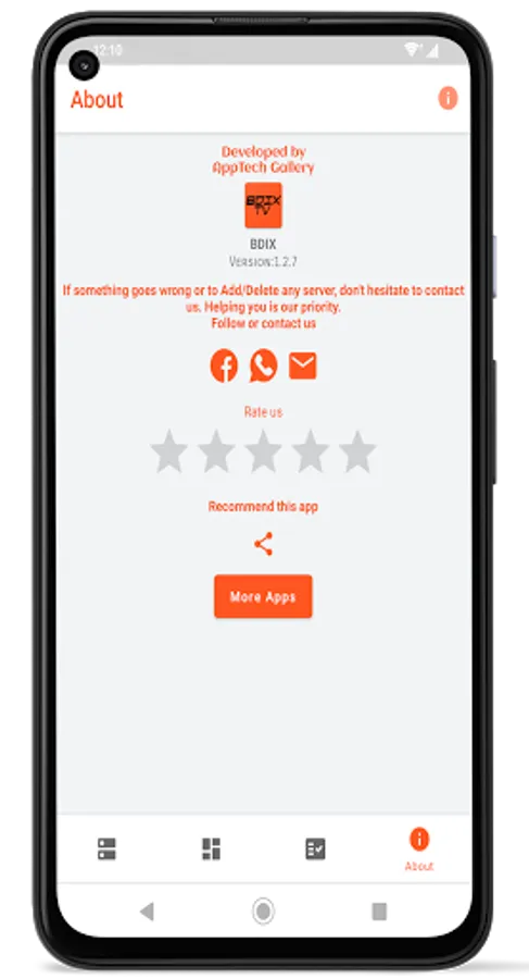 This app provides several servers from BDIX. Anyone who has a internet connection from an isp that is connected with bdix can enjoy all the bdix TV, FTP, WEB TV and their respective programmes.