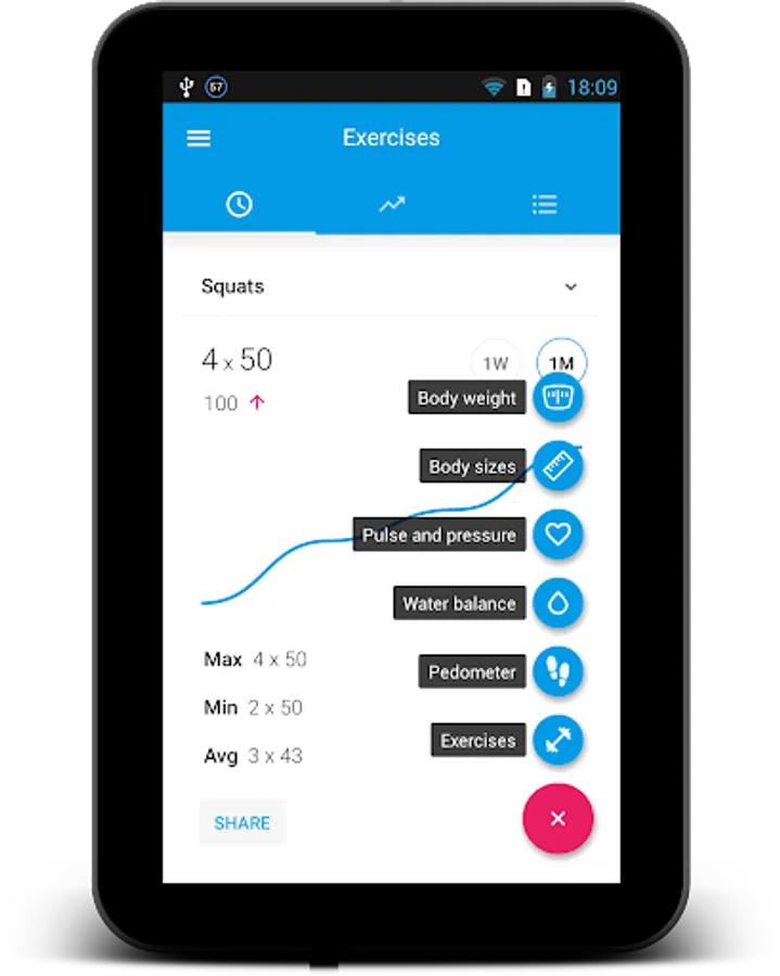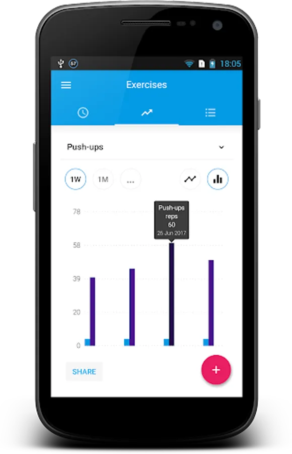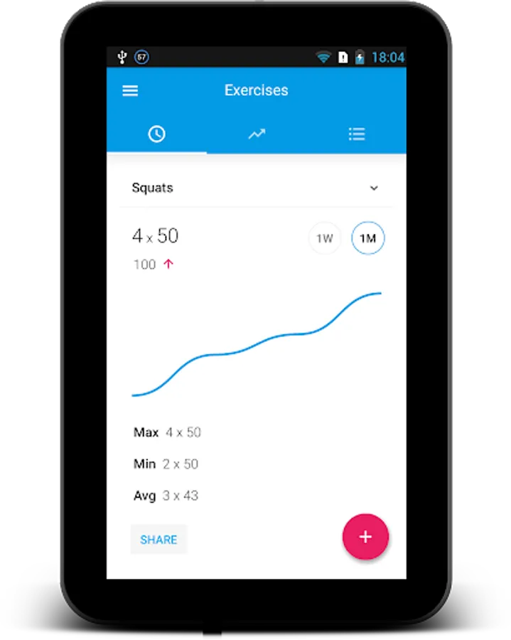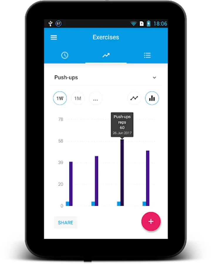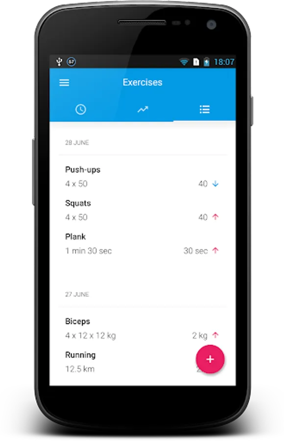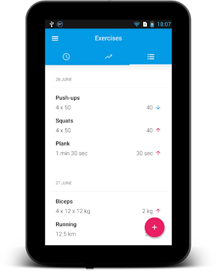 Exercise Journal already contains several most common exercises like push-ups and pull-ups, squats and lunges, abdominal and biceps exercises. But unlike most of the other fitness exercise trackers the main advantage of this one is the ability to create your own exercises that will fit your needs. Just add bench press, bench dips, deadlift, leg press, plank, your favorite cardio, crossfit, stretching, Pilates, Tabata, HIIT training or any other exercise you want to record.