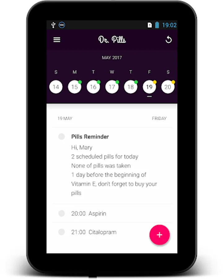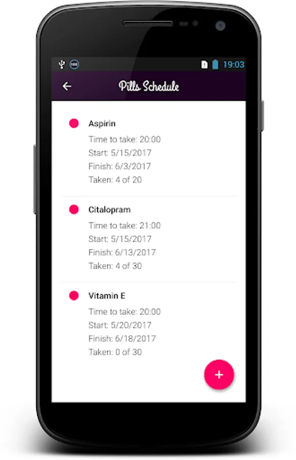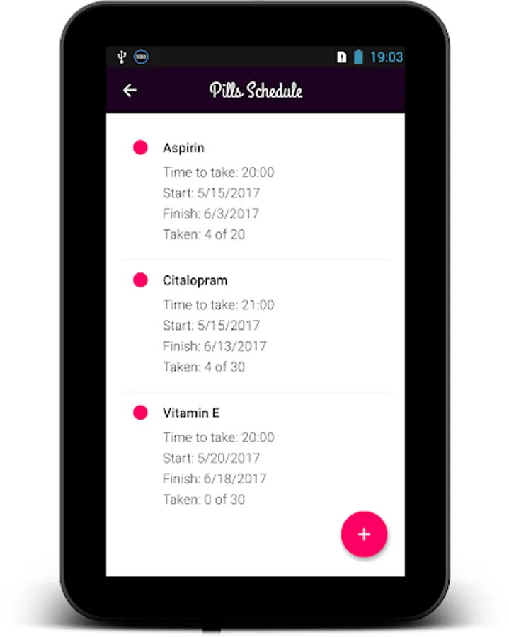 Medication Reminder even tells you to take your pill before or after eating and reminds you the right dosage of medicine. If you want app will remind you about pill until you have taken it. Just add this as well as any other important and specific to you information to your simple medication reminder app one time on start.