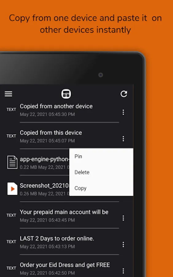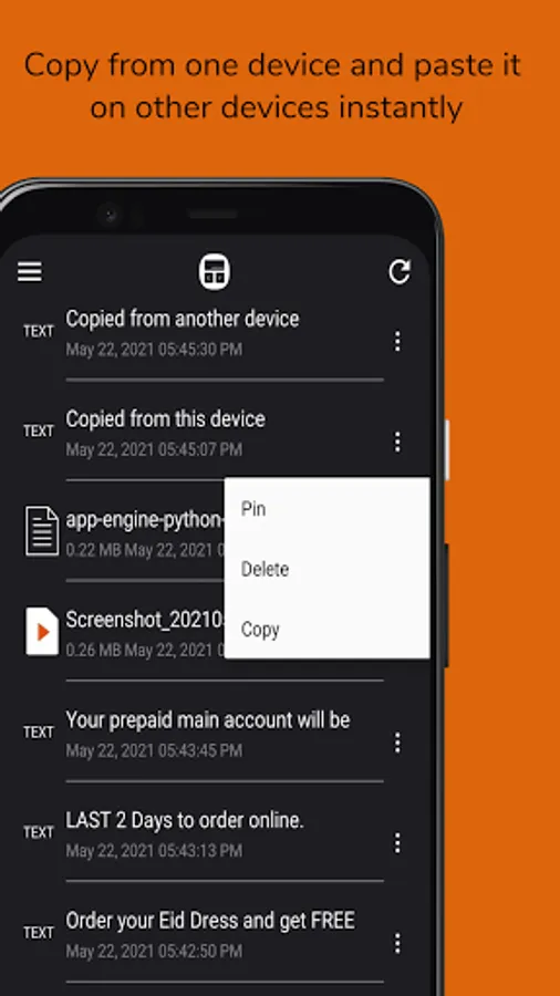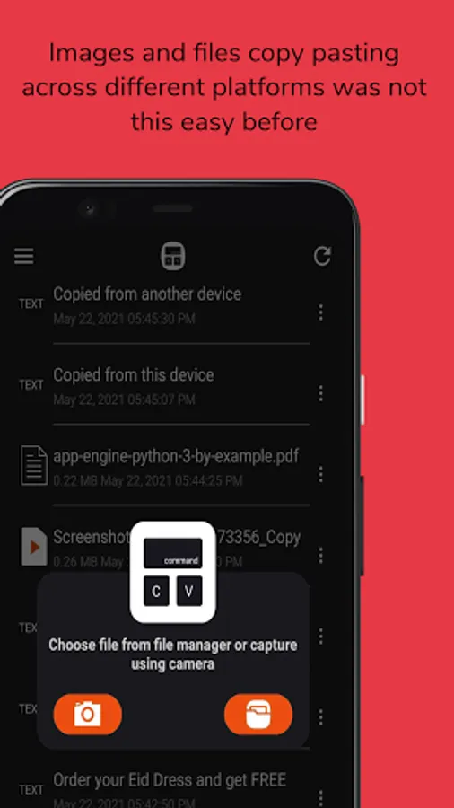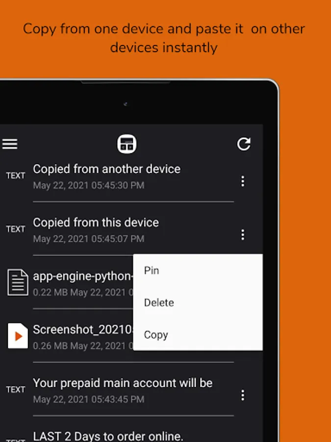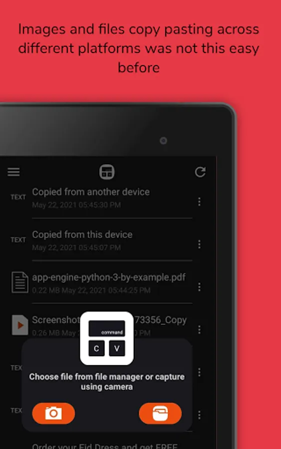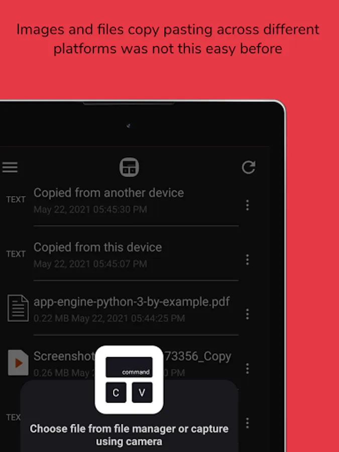 It is extremely easy to use Copy Paste. Just copy your desired text or images from any application, open your copy paste app, and it will automatically available for you to paste your text or images on your other devices. Our app will also notify you if any new clipboard is available. You can also send media to all other devices either by using your camera or by selecting files from the files manager. Once you receive the media, on opening Copy Paste, it will be automatically saved in your gallery/internal storage.
