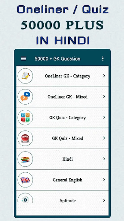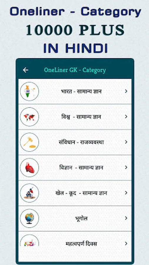 This app includes 70,000+ GK Question and it also includes thousands of MCQ questions. All Exams GK In Hindi is for all competitive exams like Civil Services, SSC, Bank PO, Railway etc. In this app 50000+ Important objective type questions are being provided. Each topic contains the simple and easy steps of learning something which you feel difficult to remember.
