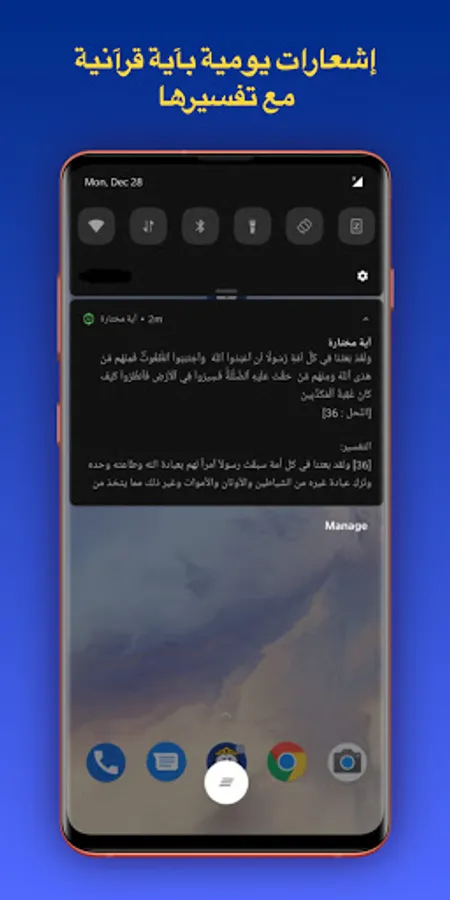 - Show notifications of verses and their interpretations: Show daily notifications of a randomly selected verse from the Holy Qur’an, perhaps it is a memory or a message, and in order for the Qur’an to broadcast present in our hearts (the feature can be turned off if desired).