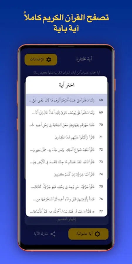 - Navigate the verses of the Qur’an from the first verse to the last verse, randomly or specifically.