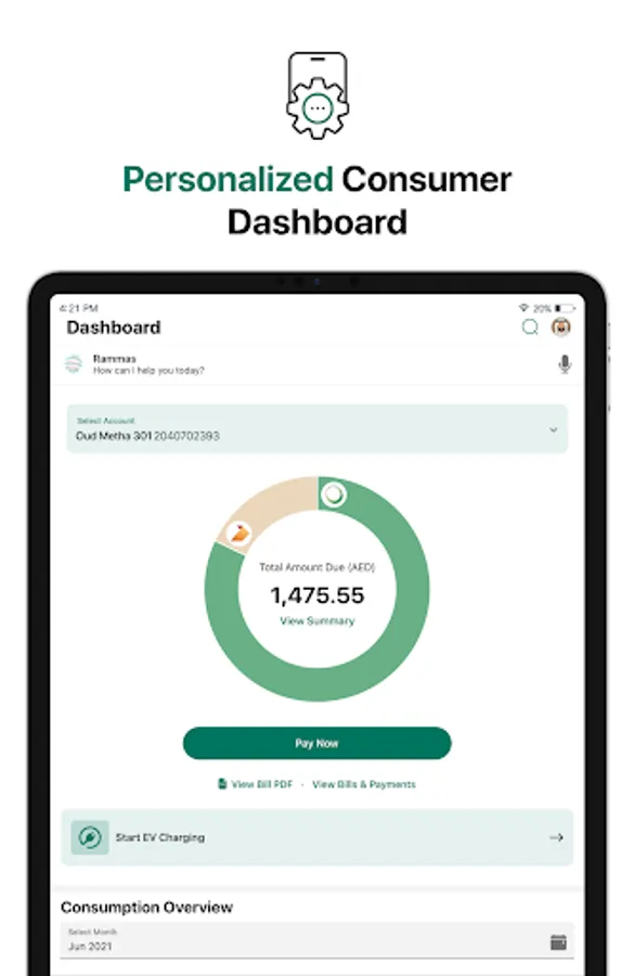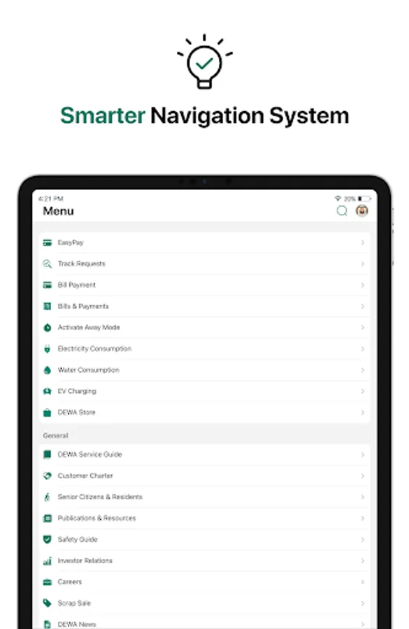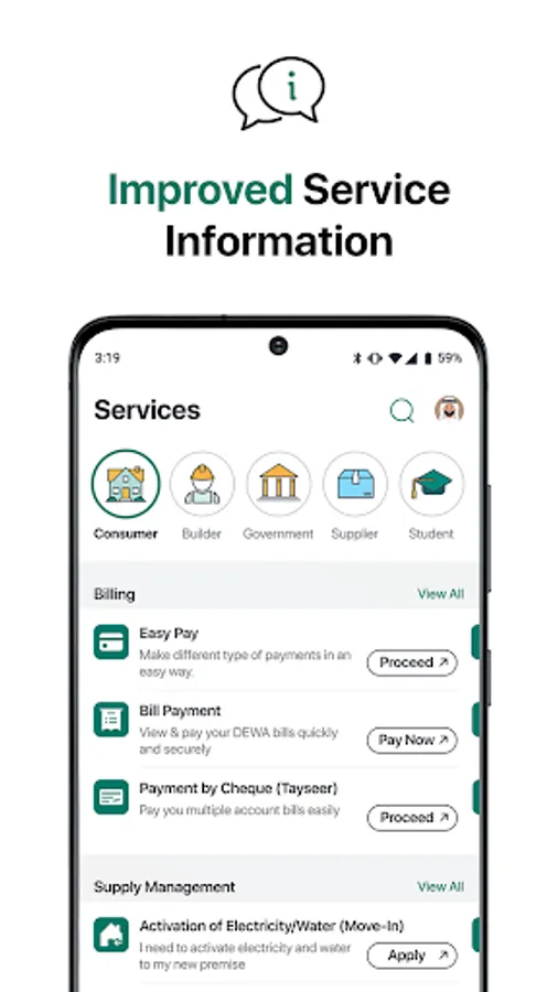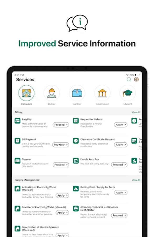 DEWA Smart App provides a unique interactive platform offering an elevated digital experience, powered by integrated bundles of innovative services and features, delicately designed to exceed the expectations of consumers, builders, suppliers, and students. The App creates an added sustainable value for all stakeholders.