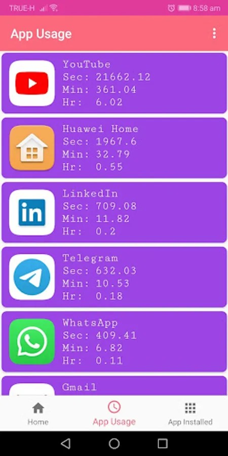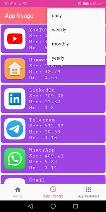 Parental Control is a simple app to track how much time you spend on each app. it can give you the app usage statics per day , week , month and year.