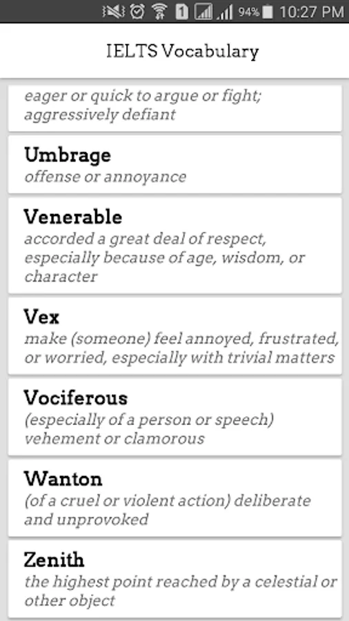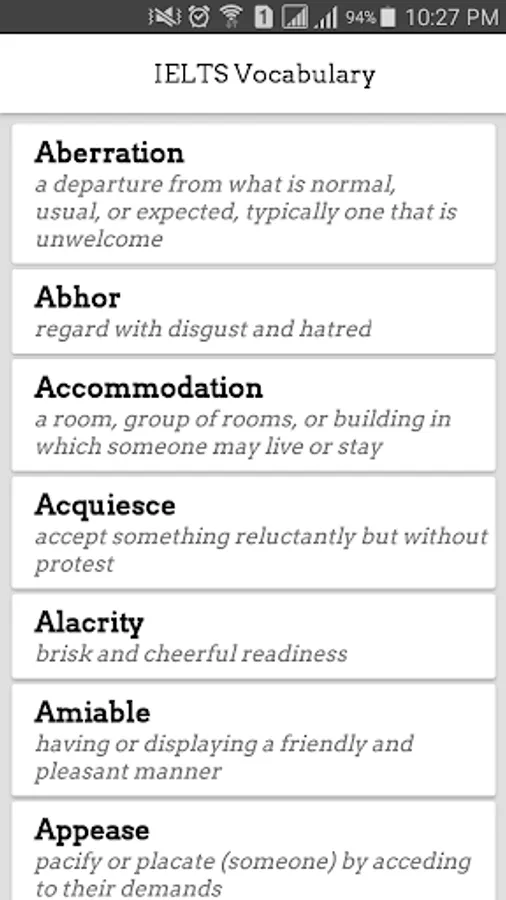 IELTS Vocabulary is a vocabulary practice app for the those who are taking IELTS preparation. Initially, it has 100+ most important IELTS Vocabulary which is picked by most experienced IELTS Tutor. This app will help students for their IELTS preparation. It will help to get a good score on IELTS examination.