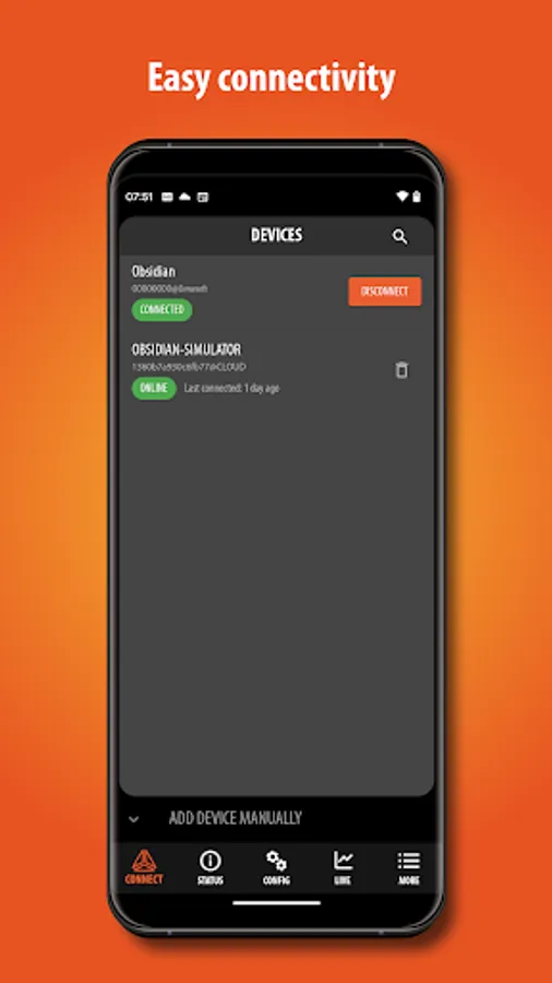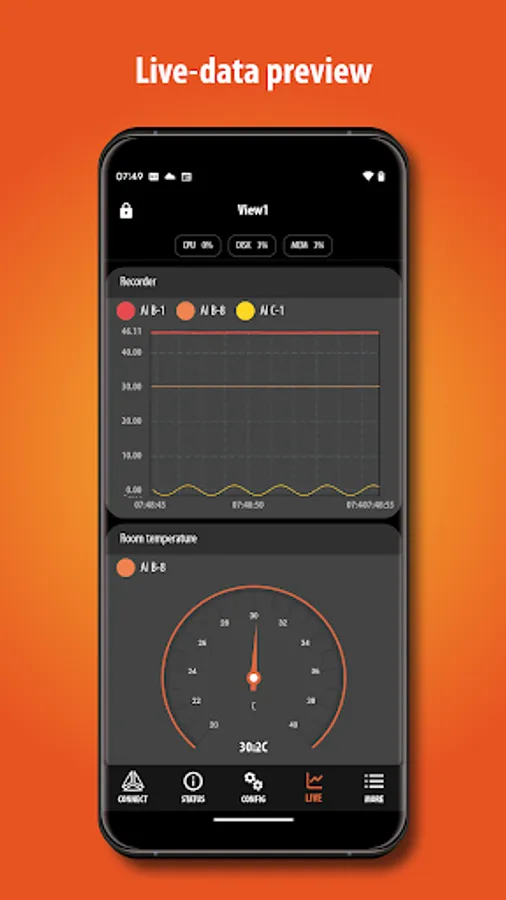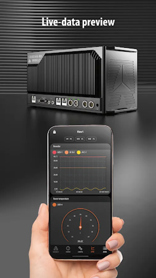 DewesoftM mobile app offers easy connectivity to the Dewesoft OBSIDIAN DAQ device from anywhere in the world. With DewesoftM, you can effortlessly stream real-time data and monitor the current status of your OBSIDIAN device. The app enables you to visualize, analyse, and monitor your live-data on multiple customizable displays with various widgets, including analog and digital meters, as well as a recorder.