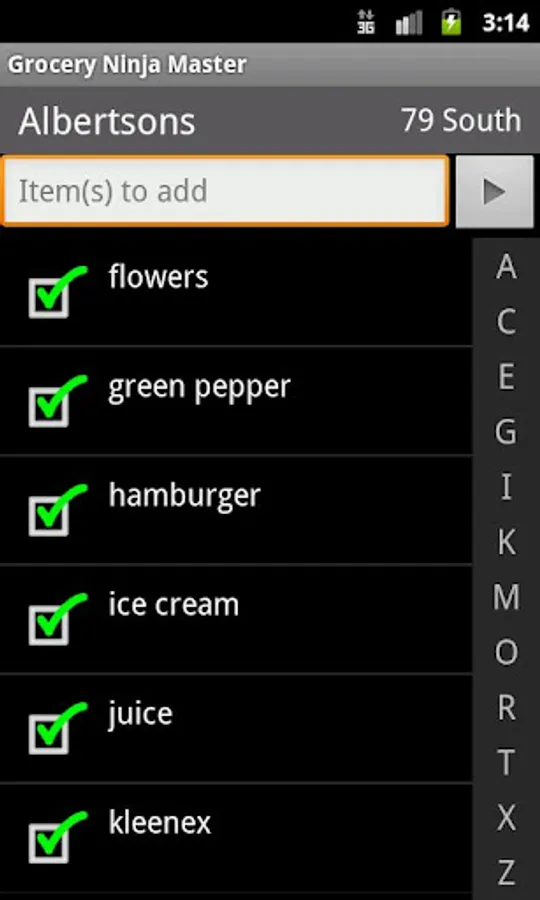 A simple, low profile app, that makes it easy to enter your grocery list, and find items in the store quickly. Either select items from your common items list, or read your list directly to the phone. Because you can enter more than one item at a time by separating them with a customizable word ("beans AND corn AND dog food AND paper towels AND spaghetti sauce"), it's super easy to add items from other lists.
