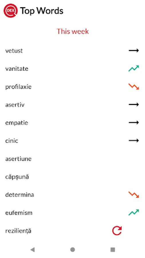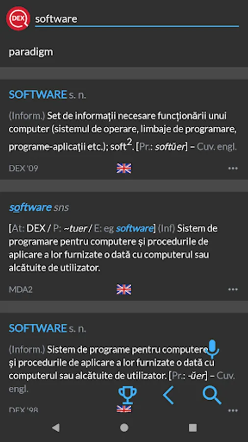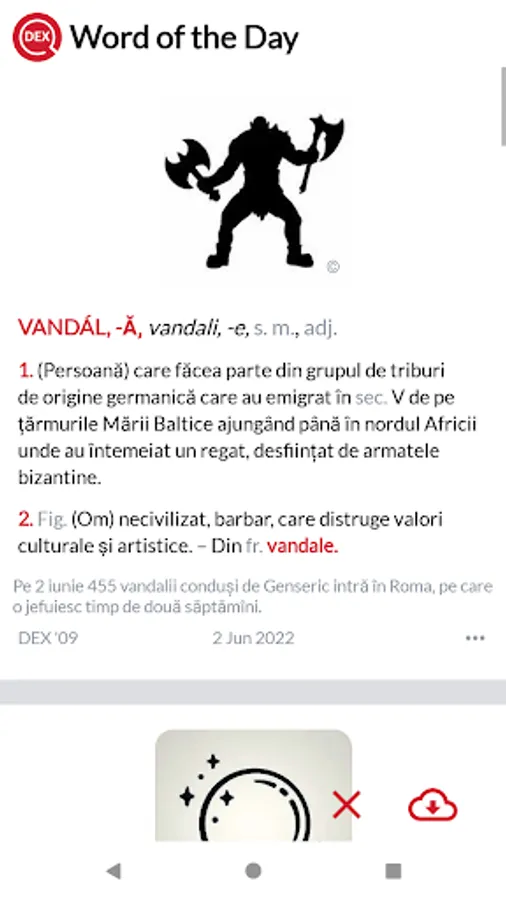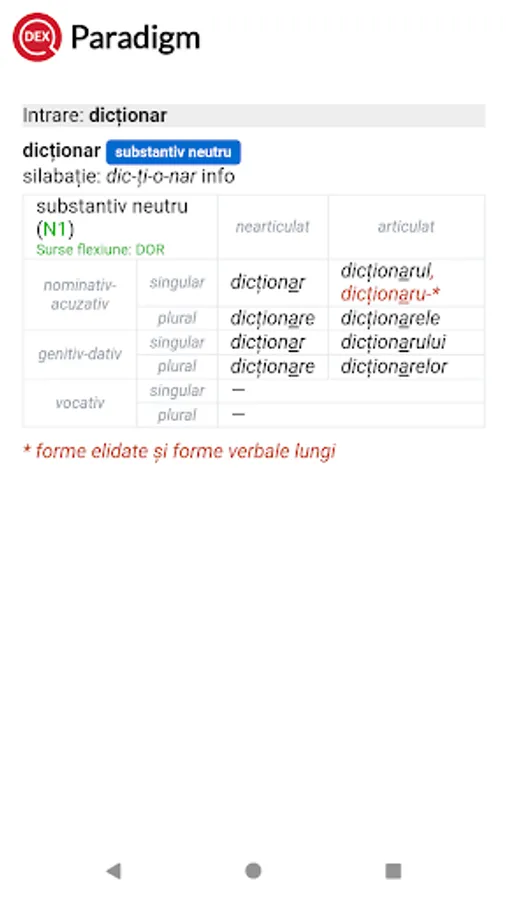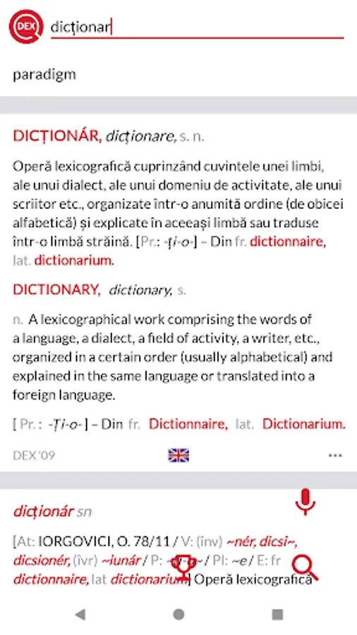 DEX for Android is an OFFLINE and online Romanian Explanatory Dictionary (Dicționar Explicativ Român) based on the well-known http://dexonline.ro, while being packed together with educational games and containing many options for configuration.