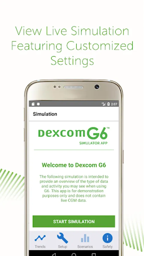 The simulator displays samples of CGM scenarios, trends, and various setup features associated with the Dexcom G6 CGM App.