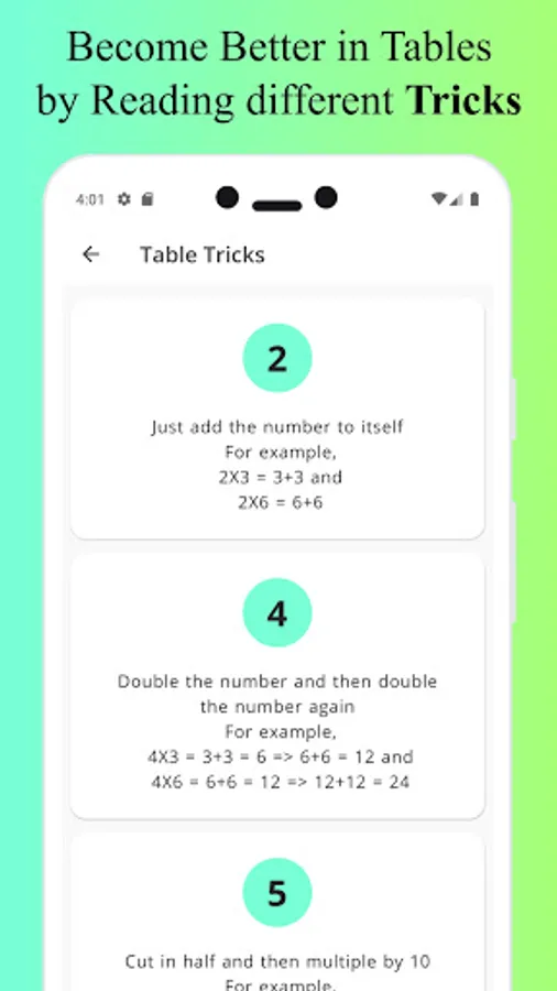 This app has multiplication tricks for the table from 2 to 20, you can also refer to these tricks to learn math tables 11 to 20. Math tables is a great way to help teach kids classic multiplication tables.