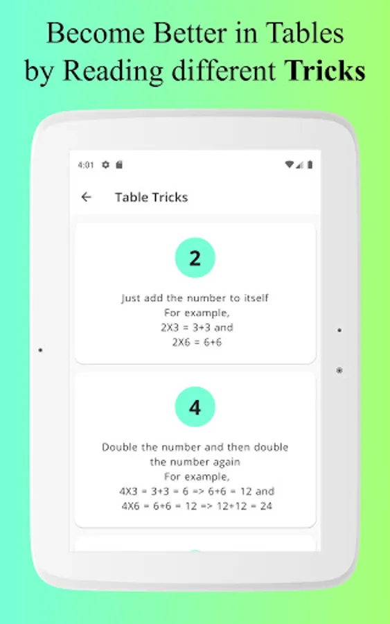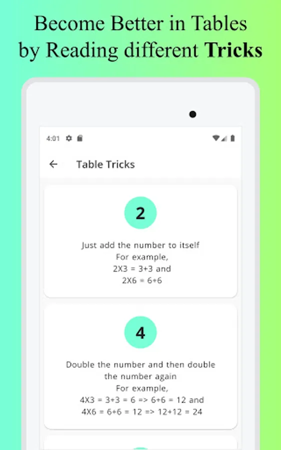 This app has multiplication tricks for the table from 2 to 20, you can also refer to these tricks to learn math tables 11 to 20. Math tables is a great way to help teach kids classic multiplication tables.