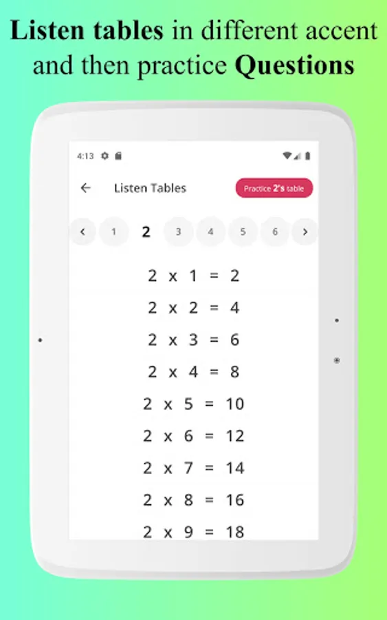 Multiplication tables is a free learning app for kids. Using these kids can learn tables up to 10 and also table up to 20 or math tables 1 to 20. This app features times table up to 100 which includes 13 times table, 14 times table, 15 times table, and 16 times table, and so on.