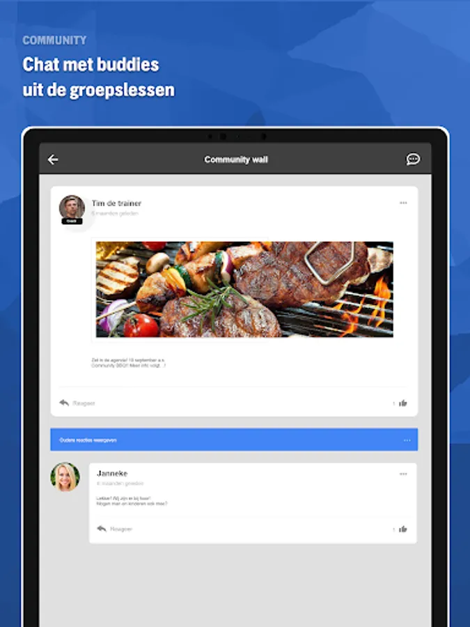 - Houd je trainingprogressies bij en volg je trainingbuddies.