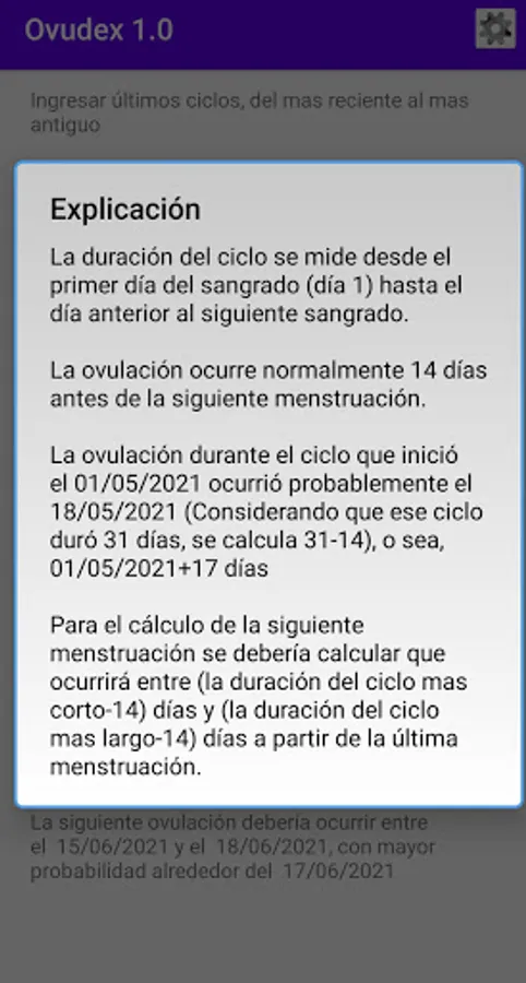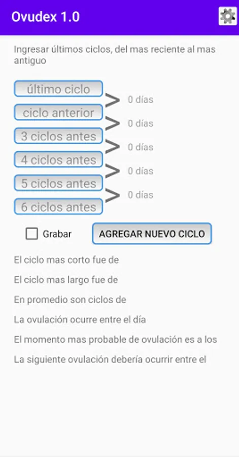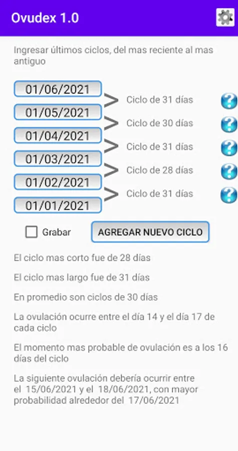 Free application without ads to evaluate the regularity of the cycles and calculate the probable ovulation date.