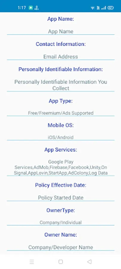 Apps Privacy Policy Generator is for generate privacy policy.User can generate or make privacy policy in a minute very easily.This apps privacy policy generator app for all developer who want generate privacy policy for there app.