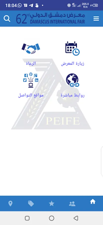 تطبيق معرض دمشق الدولي 62 هو المنصة الالكترونية الرسمية الخاصة بمعرض دمشق الدولي و التي يمكن من خلالها الاطلاع على جميع الفعاليات التجارية و الصناعية و الخدمية الخاصة بمعرض دمشق الدولي 62