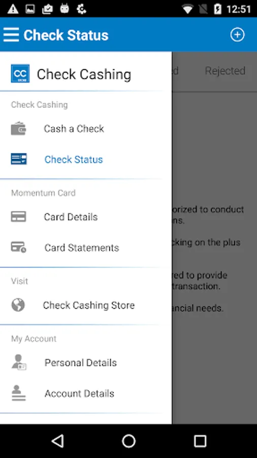 With the The Check Cashing Store® Mobile app, you can now deposit your checks directly to your bank account or your Momentum® Prepaid MasterCard® or to any of your personal Visa, MasterCard, Discover or prepaid DEBIT card by simply taking a photo of your checks and submitting them. You can also view your transaction history so you always know your card balance and manage your spending habits.