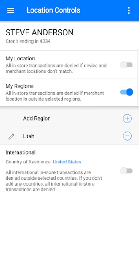 Define a geographic region where your cards can be used or use My Location to ensure your card is only being used when it’s with you.