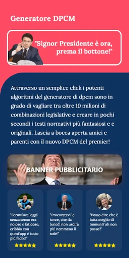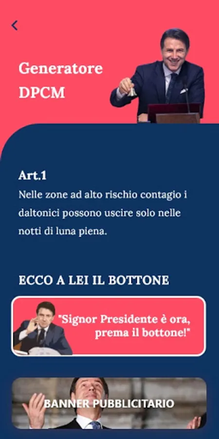 Through a simple click, the powerful algorithms of the DPCM generator are able to sift through over 10 million legislative combinations and create the most imaginative and original regulatory texts in a few seconds. Leave friends and relatives speechless with the new Prime Minister's DPCM!