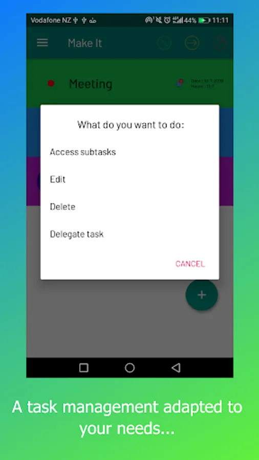 In one click, on each of your tasks you will access all the options: modify, delete, delegate, add a reminder, see the sub-tasks. No zigzag gesture to memorize, just a click.