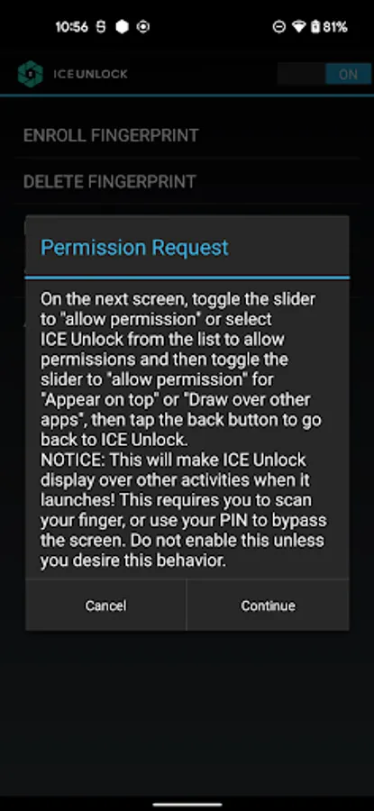 Display over other apps permission is requested to allow ICE Unlock to be displayed prior to other apps when the device is unlocked.