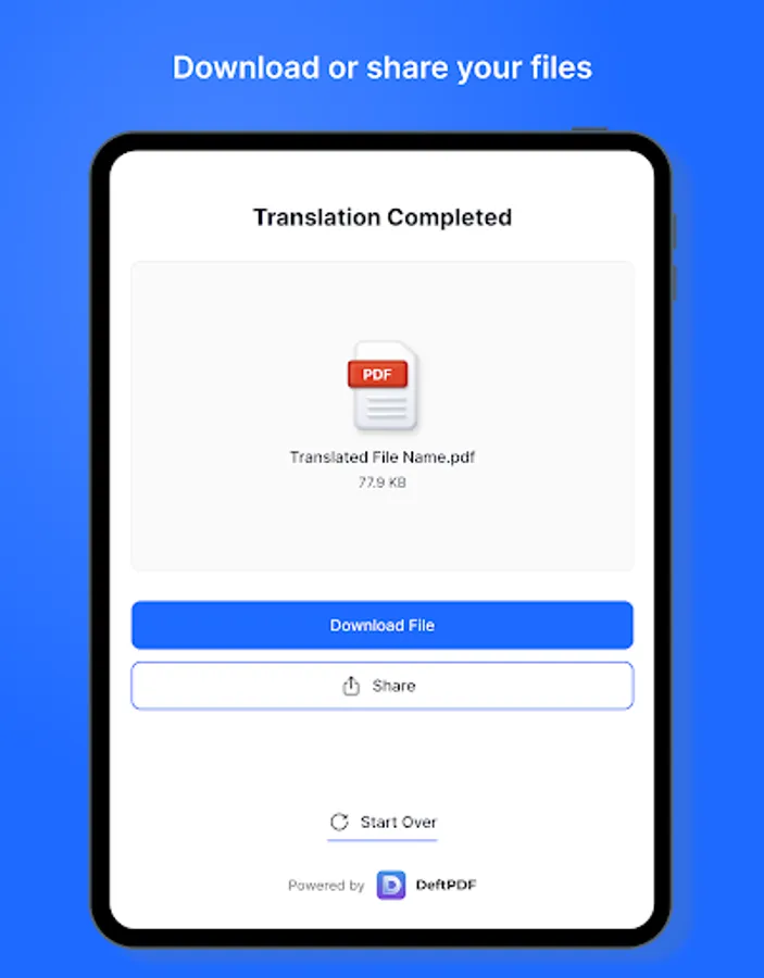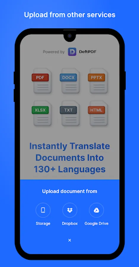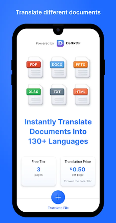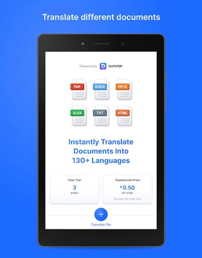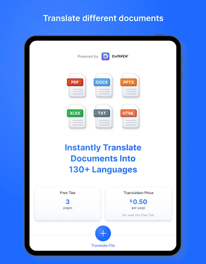 DeftPDF Document translation Instantly translates documents into 130+ languages. You can use our app to translate document in PDF, Docx, PPTX, CSV, ODT, ODS, ODP, Xlsx, Txt, and formats.