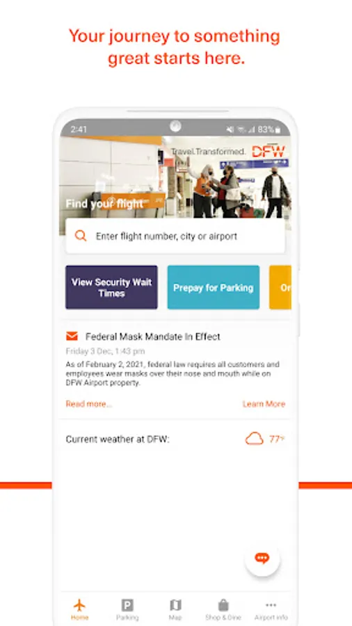 DFW’s official mobile app is the perfect addition for your next trip. With the app, you can: