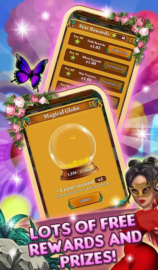 Each time you solve one of our matching puzzles you’ll have the chance to open a magic chest – they contain collectibles, coins and exciting power ups to use! Remember to empty your magic coin globes & get more coins every second!