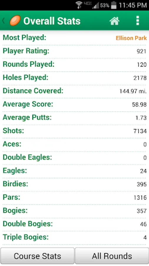 * Overall and course level score stats including average putts, best score, eagles, birdies, pars, bogies... and whatever comes after bogies!