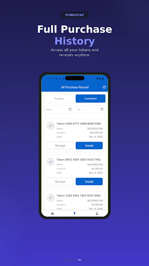 This platform is for Private Residents/Homeowners in Selected Estates and Service Apartments to purchase Electricity Units online for their Prepaid Meters. It provides a convenient way to vend electricity tokens on their phone from the comfort of their home or any location. They can view spend, user profile, meter profile and purchase history. They can also generate receipt of their purchases.