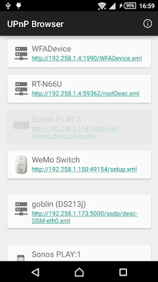 A simple and Open Source UPnP Browser. View local UPnP devices, and click to view their device description xml in your browser. Simple and Materialistic UI. No ads, no nags.