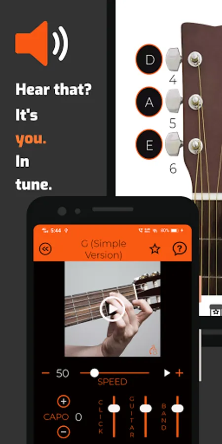 • Capo feature that transposes the guitar play-along track and matches the position of a capo placed on the guitar.