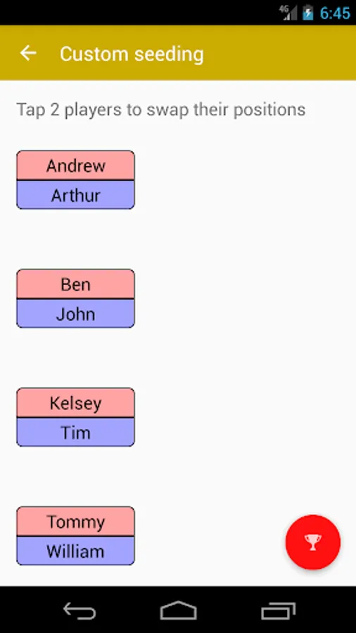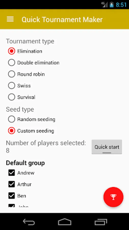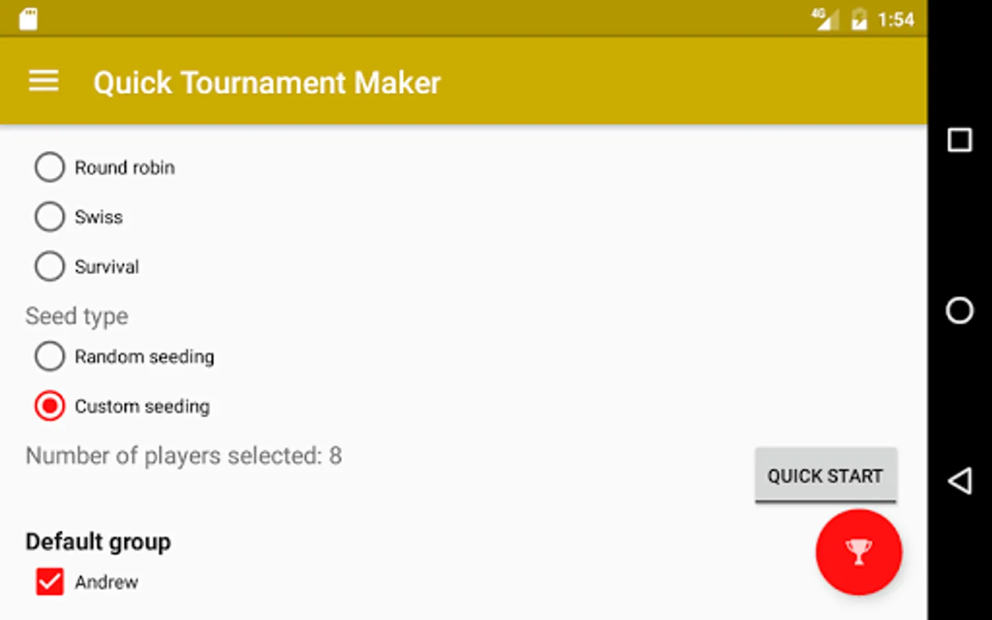 Have you ever wanted to set up a tournament with your friends but can never decide how to schedule the matches? Quick Tournament Maker strives to take away the hassle of deciding by creating the schedule for you.