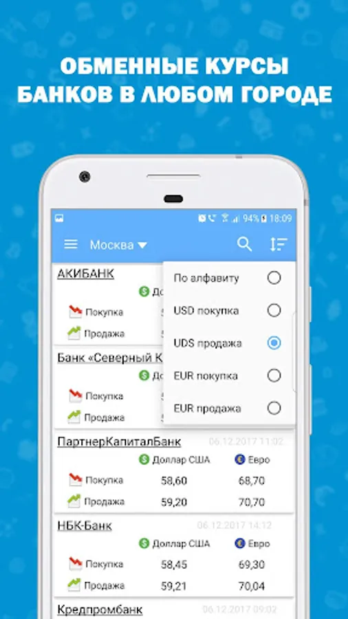 In the application, you can view the exchange rate of any bank in your city or any other city in Russia.