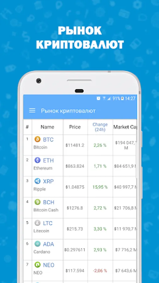 Always current data cryptocurrency. Monitoring of prices and growth dynamics cryptocurrency such as Bitcoin, Ethereum, laytkoin and many others.