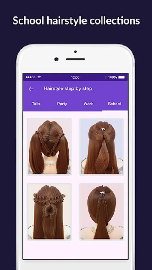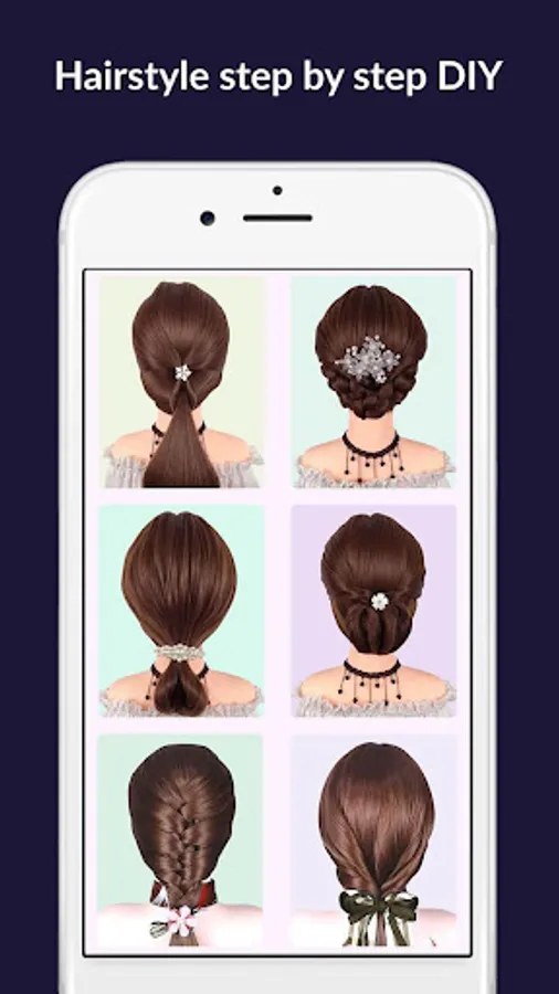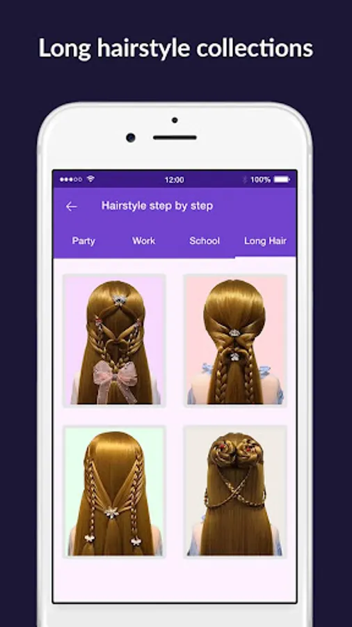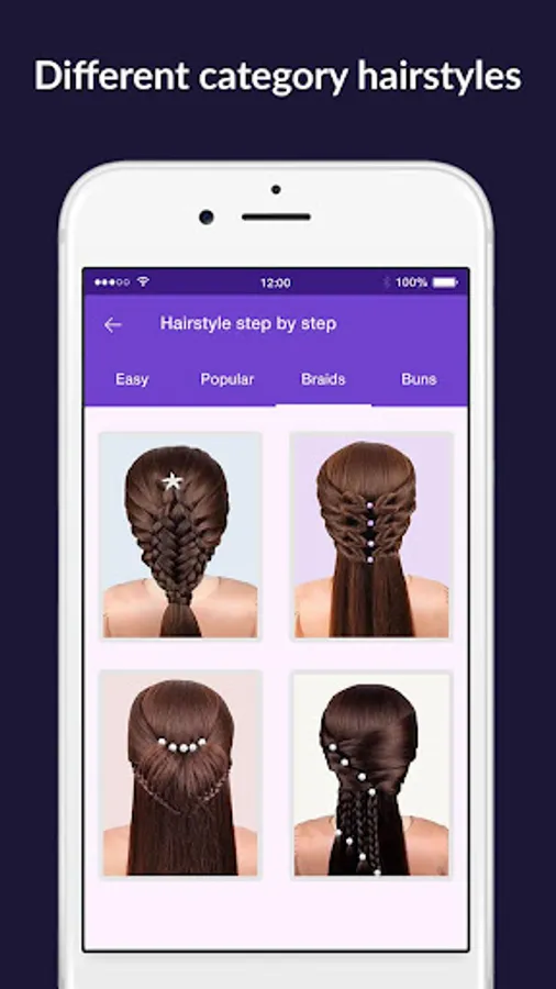 In the app, there are 10 different categories of hairstyles like Braids, Bun, Easy, Long Hair, Popular, Party, School, Short Hair, Tails, and Office.
