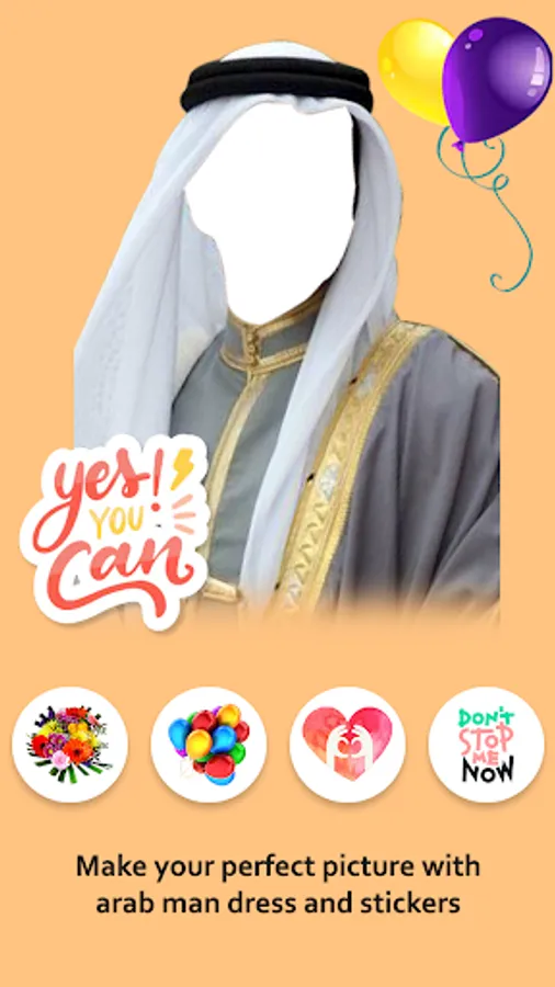 Arab Man Dress Photo Studio app serves the users with features like incredible collection of Arab Man photo suits, text effects, sticker options, background photo frames, background color, etc.