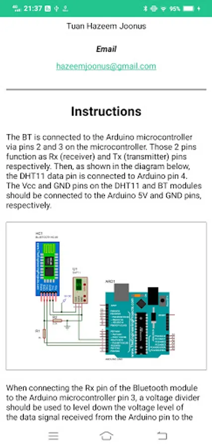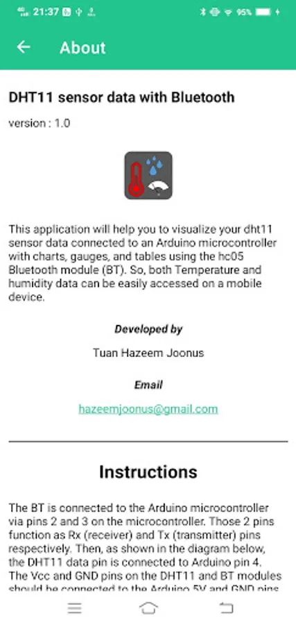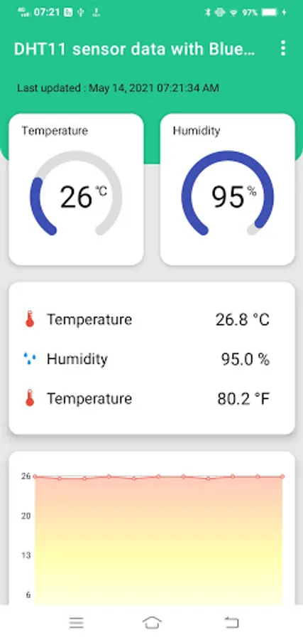 This application will help you to visualize your DHT11 sensor data connected to an Arduino microcontroller with charts, gauges, and tables using the HC-05 Bluetooth module (BT). So, both Temperature and humidity data can be easily accessed on a mobile device.
