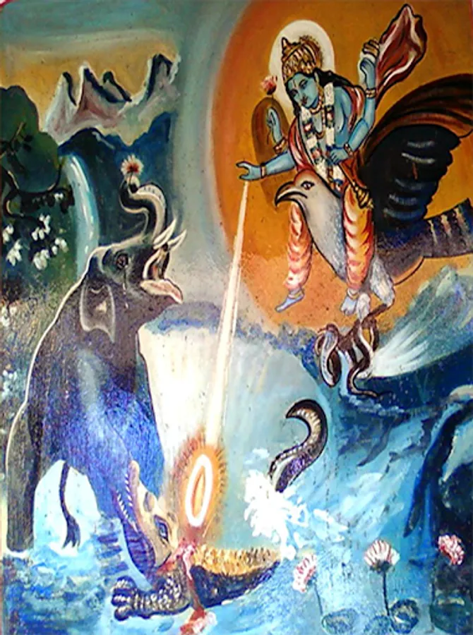 Gajendra tried for a long time to escape from the crocodile's clutches. When he had spent his last drop of energy, Gajendra called to the god Vishnu to save him, holding a lotus up in the air as an offering.