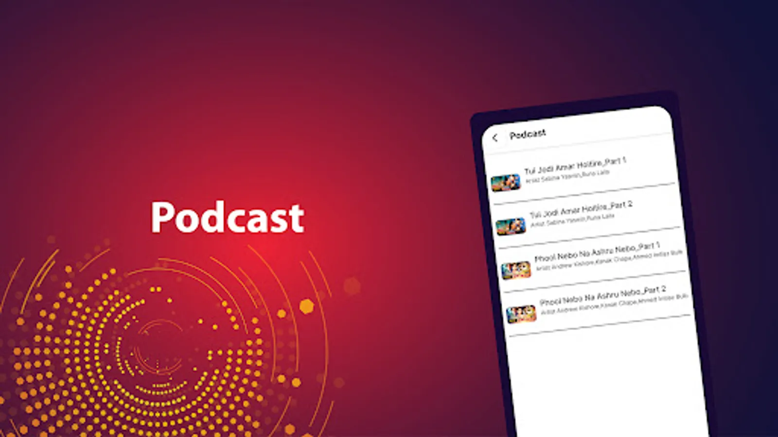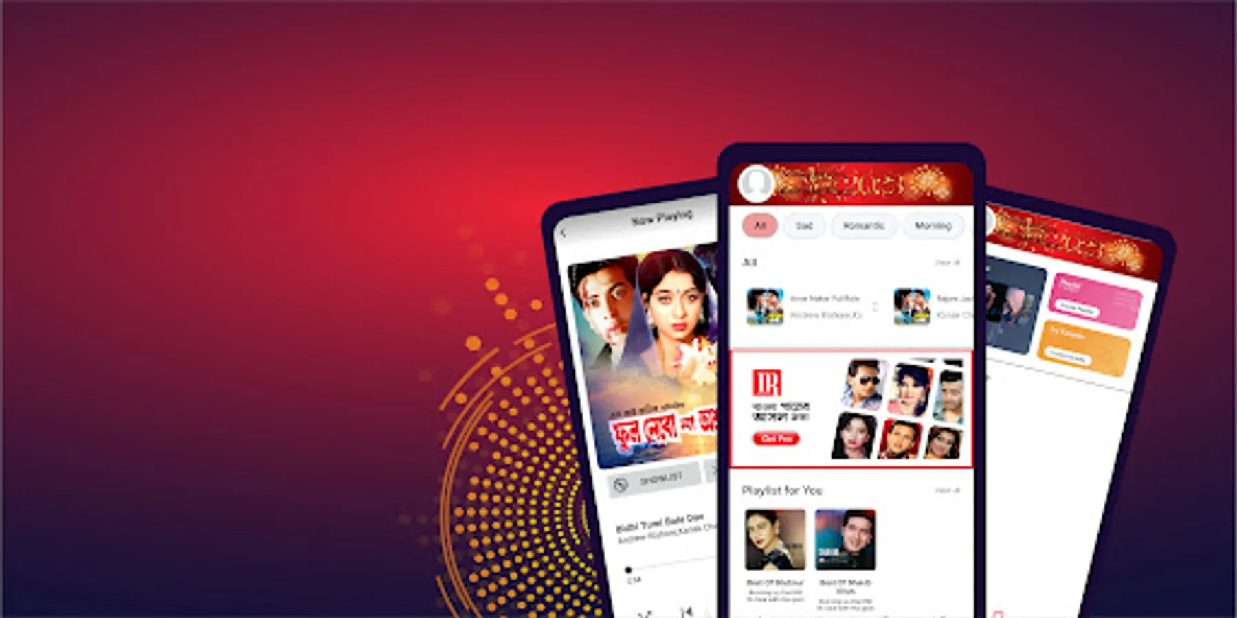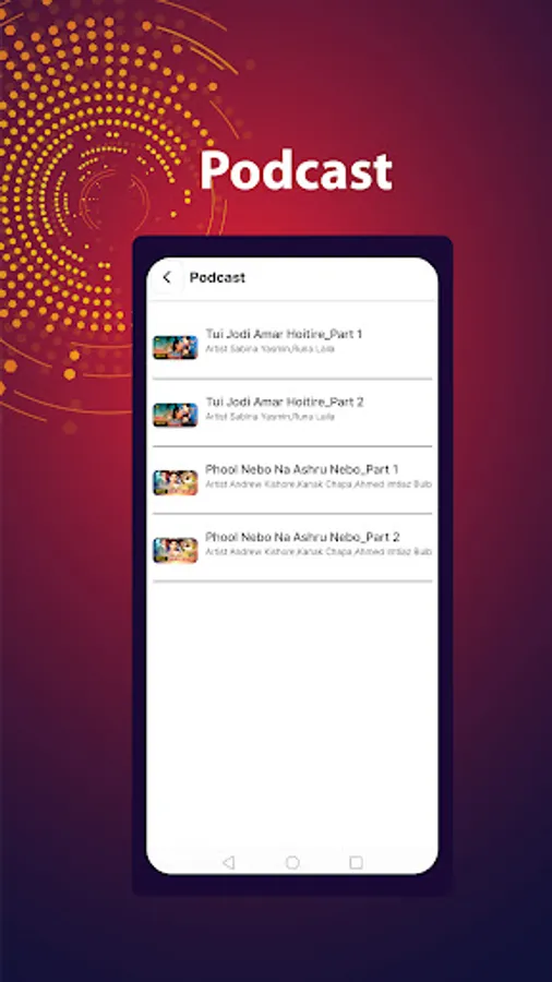 Dhaka Record music app offers a variety of top Bangladeshi songs like Bodhu Beshe Konna Jokhon, Amar Moto Eto Sukhi, E Jibon Tomake Dilam, Bidhi Tumi Bole Dao, and a lot more; sad songs like Premer Somadhi Bhenge, O Sathire Jeona, E Jibon Keno Eto Rong Bodlay and Original songs such as Ek Din Bolechile, Raat Baaki, Borishailla Maiya, Girlfriend & many more. Enjoy songs of top Bangladeshi actors like Salman Shah, Shakib Khan, Moushumi, Shabnur & many others.
