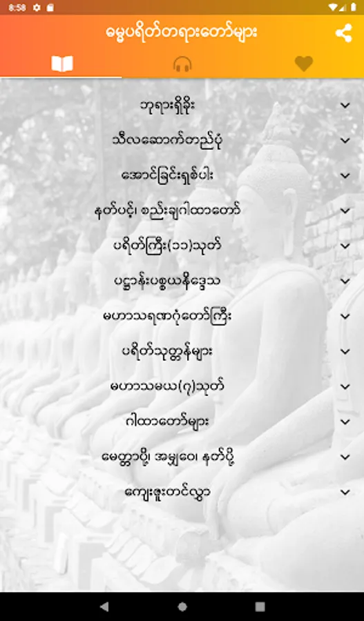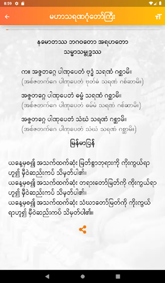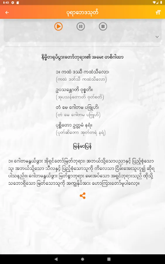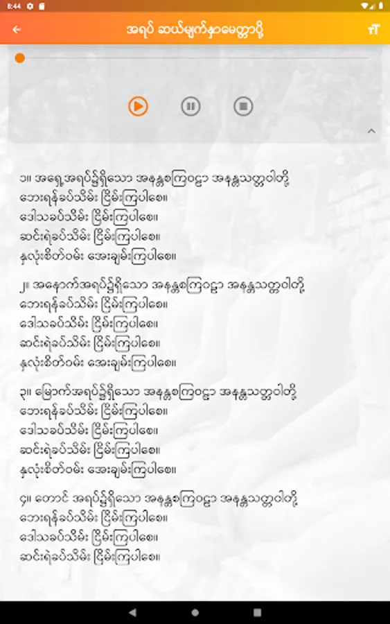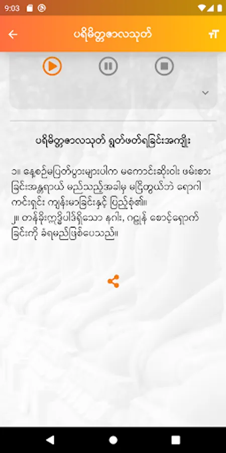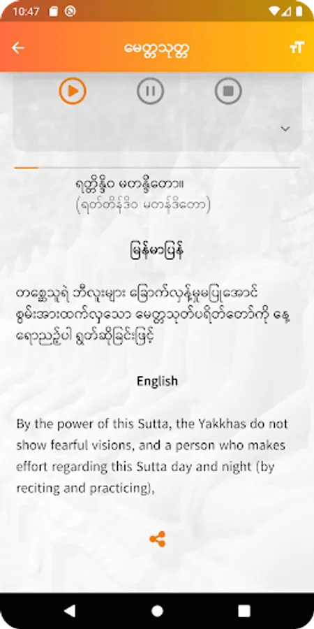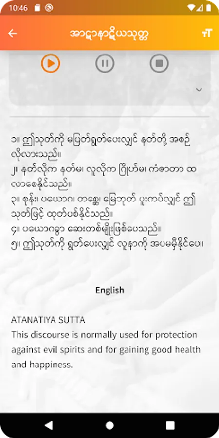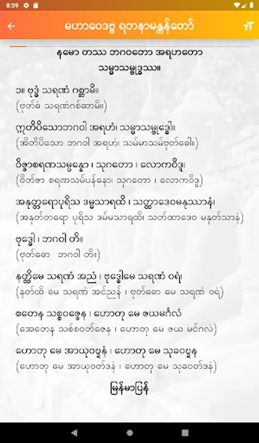 In this Dhamma Payeik App, we have included the essential collections of paritta verses and paritta suttas (Buddha's words and teachings) with accompanying Burmese pronunciations so that all Burmese including those who are not familiar with pali language can recite Buddha's parrita verses and scriptures to bring safety, peace and well-being to the community. We have also added the meaning and translations of the paritta suttas so that people can fully understand the virtues of Buddha as well as his wonderful teachings and discourses.