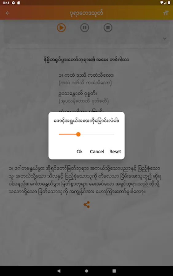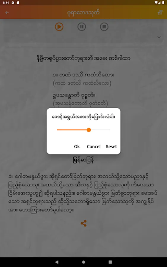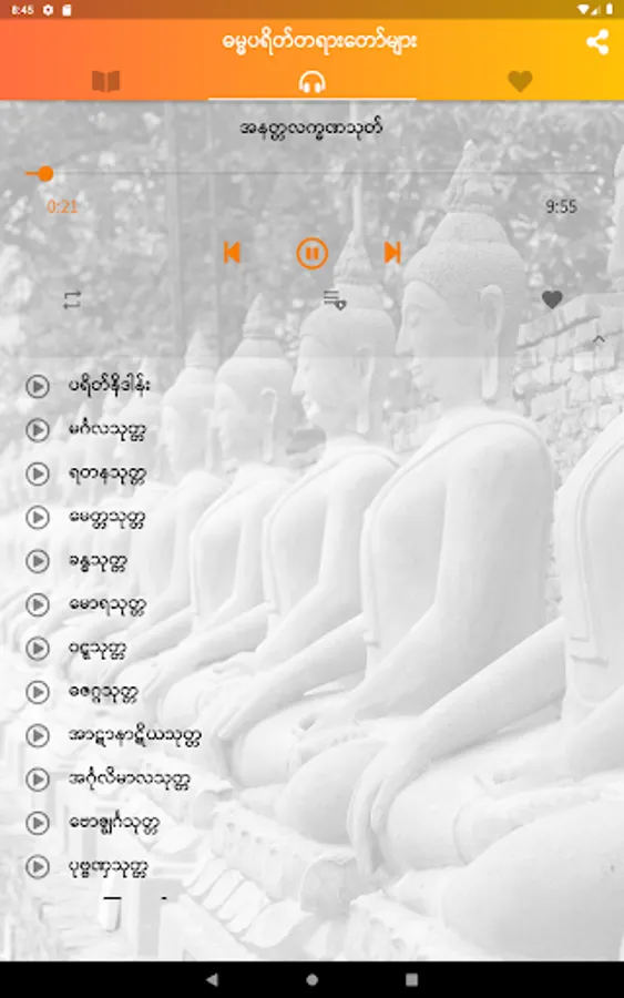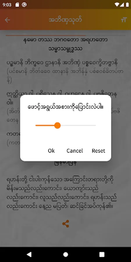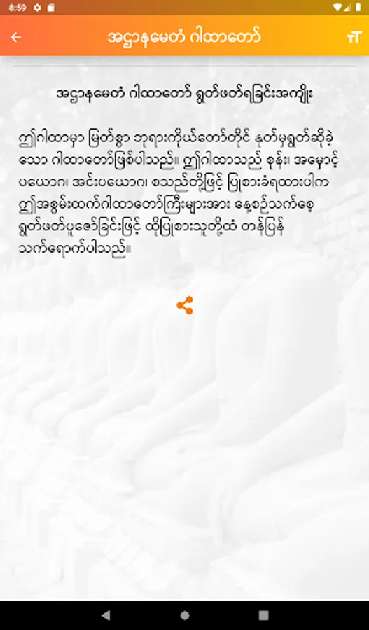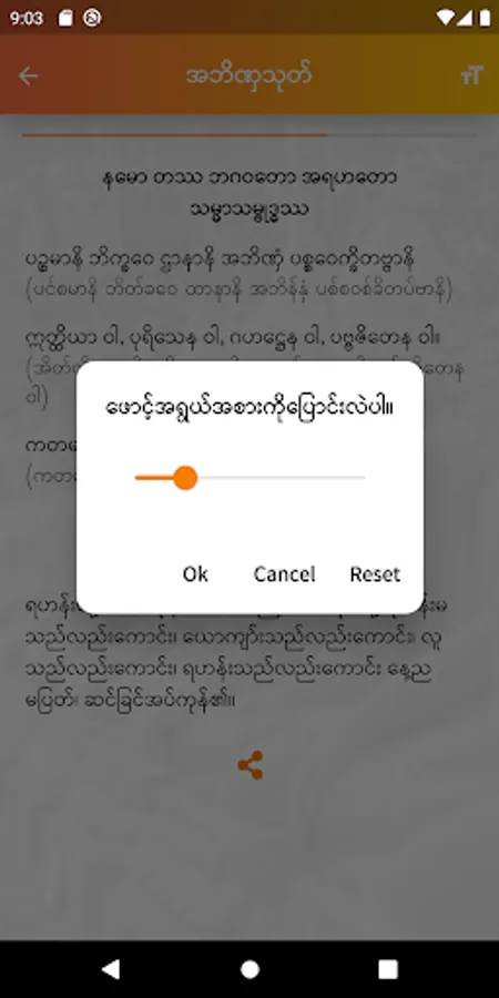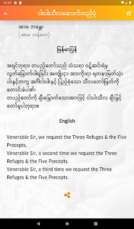 In this Dhamma Payeik App, we have included the essential collections of paritta verses and paritta suttas (Buddha's words and teachings) with accompanying Burmese pronunciations so that all Burmese including those who are not familiar with pali language can recite Buddha's parrita verses and scriptures to bring safety, peace and well-being to the community. We have also added the meaning and translations of the paritta suttas so that people can fully understand the virtues of Buddha as well as his wonderful teachings and discourses.